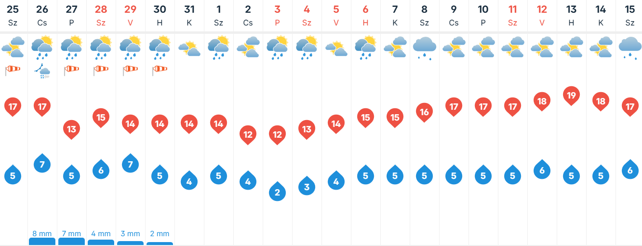 Csütörtökön már egy mediterrán ciklon okozhat nagy kontrasztot. A Dunántúlon borongós idő jöhet kiadós esővel, az Alpokalján és a Bakonyban havas eső, hó is hullhat, valamint erős, viharos lökések kísérhetik az északias szelet. Itt csak 3 és 12, a Dunától keletre még 13 és 20 fok között alakulhat a csúcshőmérséklet. Utóbbi tájakon még hosszabb-rövidebb időre kisüthet a nap, majd itt is egyre többfelé eleredhet az eső. Errefelé a déli-délkeleti szelet kísérhetik élénk, erős lökések.