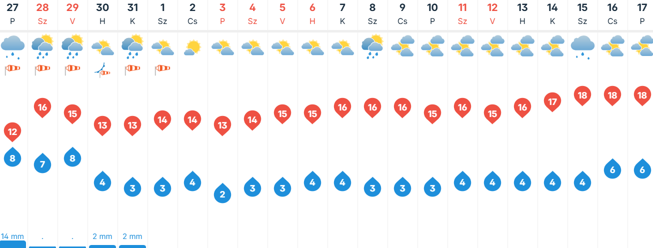Pénteken borult, esős, záporos napunk lehet Szegeden, sőt egy-egy zivatar sem kizárt. A felhők és a csapadék mellett sokfelé lehet erős, viharos az északias szél is. Reggel 8 fok körüli minimumokra van kilátás, délután 12 fok körül alakul majd a hőmérséklet városunkban.