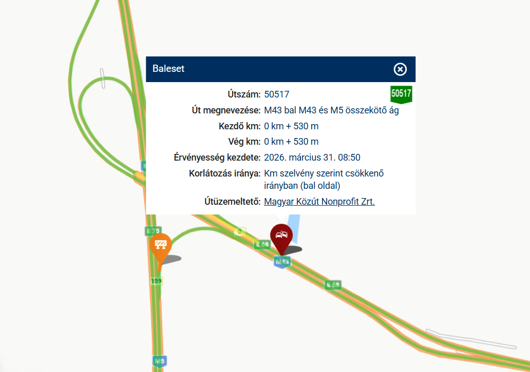 Információk szerint csak a leállósávban halad a forgalom. Törmelék is borítja az útszakaszt. Vezessetek óvatosan!