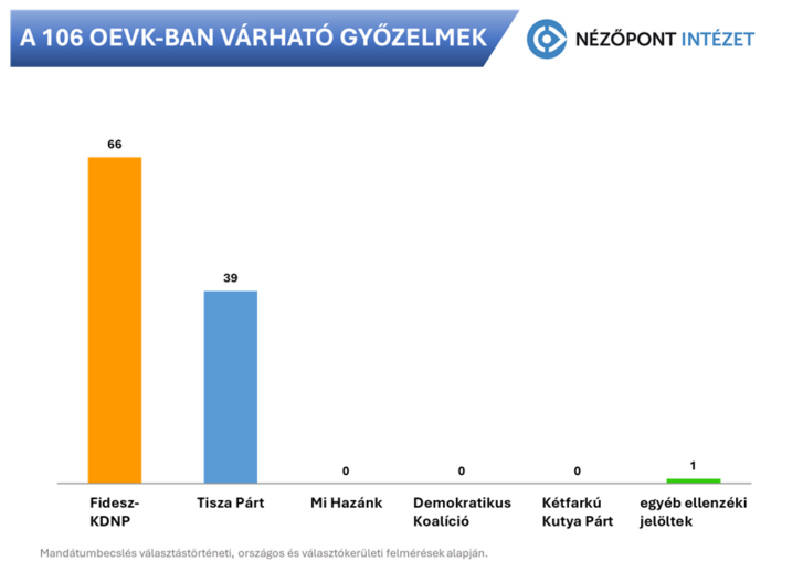 Megszületett a Nézőpont Intézet mandátumbecslése: e szerint a választástörténeti és országos közvélemény-kutatási adatok, valamint a 2026 során számos választókerületben végzett önálló felmérések alapján arra a becslésre jutottak, hogy a 106 választókerületből 66-ban a kormánypárti jelöltek kaphatják majd a legtöbb voksot.