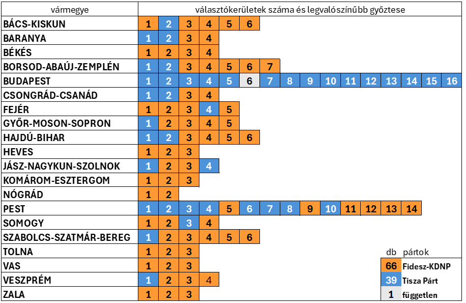 A Nézőpont Intézet szerint mivel a Fidesz támogatottsága vidéken, a Tisza Párté a városokban erősebb, nem meglepő, hogy a kormánypártok jelöltjei elsősorban a kisvárosias és községek által dominált választókerületekben diadalmaskodhatnak. Ezzel szemben Miskolcon, Debrecenben, Szegeden, Pécsett vagy Nyíregyháza és Győr egyes részein a Tisza Párt jelöltjei esélyesebbek.