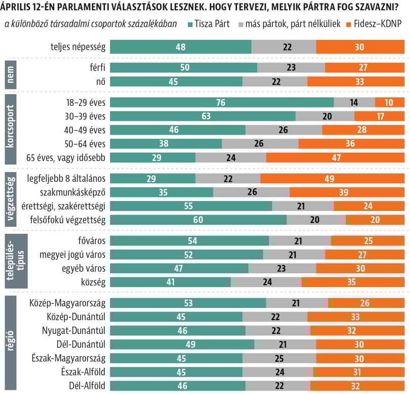 Iskolai végzettség szerint továbbra is nagyok a különbségek: a diplomások és az érettségivel rendelkezők abszolút többsége a Tiszára szavaz, csak negyedük-ötödük fideszes. A szakmunkásképzőt végzetteknél egy kicsivel vezet a Fidesz, a nyolc osztályt vagy kevesebbet végzettek körében viszont már jelentős az előnye: 49 százalék fideszes a 29 százalék tiszás ellenében – részletezi a mérések eredményeit a lap.