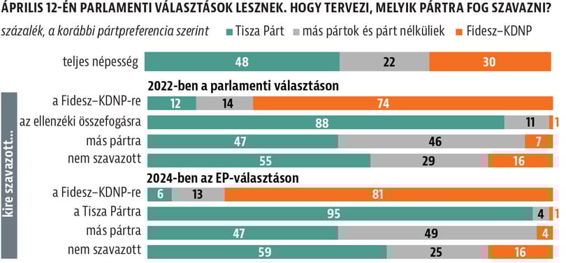 A Márki-Zay Péter vezette ellenzéki összefogás szavazóinak csaknem kilenctizede tiszás lett, míg az egyéb pártok szavazóinak közel fele, az akkor nem szavazóknak pedig több mint a fele voksolna a Tiszára, de még a korábbi Fidesz-szavazók egynyolcadát is sikerült elcsábítania Magyar Péternek. Ezzel szemben a Fidesz elveszítette a négy évvel ezelőtti szavazóinak egynegyedét, igaz, az akkor nem szavazók 16 százaléka a Fidesszel szimpatizál – hangsúlyozza a lap.