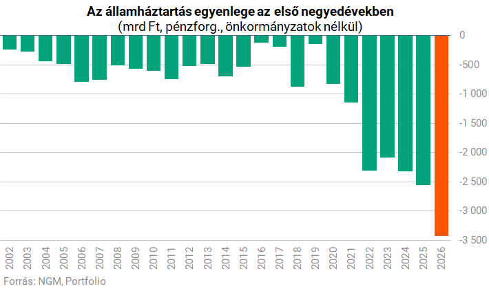 A 2026-os év első három hónapjában az államháztartás központi alrendszere 3420 milliárd forintos hiánnyal zárt. A Nemzetgazdasági Minisztérium friss adatai szerint a márciusi hiány kiemelkedően magas lett: egyetlen hónap alatt több mint 1300 milliárd forintos hiányt halmozott fel a magyar költségvetés. Ennek köszönhetően az első negyedév végére megközelítettük az éves deficit több mint 80%-át.