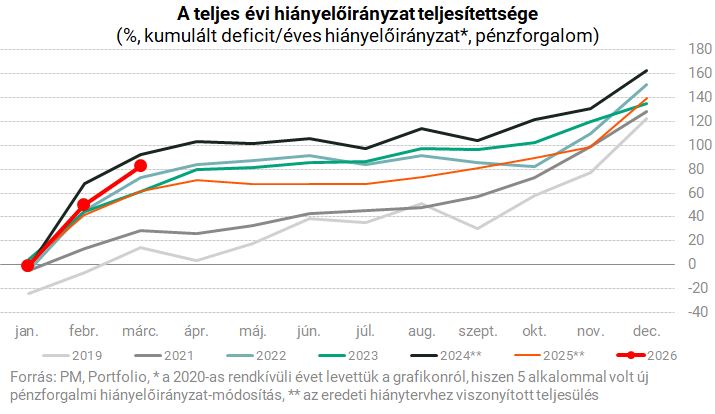 Ennek köszönhetően március végére az egész évre tervezett költségvetési hiány 83%-ánál jár a deficit.