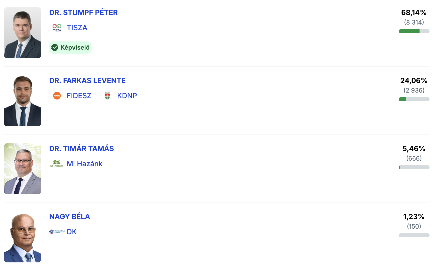 A két szegedi választókerületben is Tisza-jelölt dominál jelenleg, az 1-esben Stumpf Péter, a 2-esben Gajda Attila vezet.