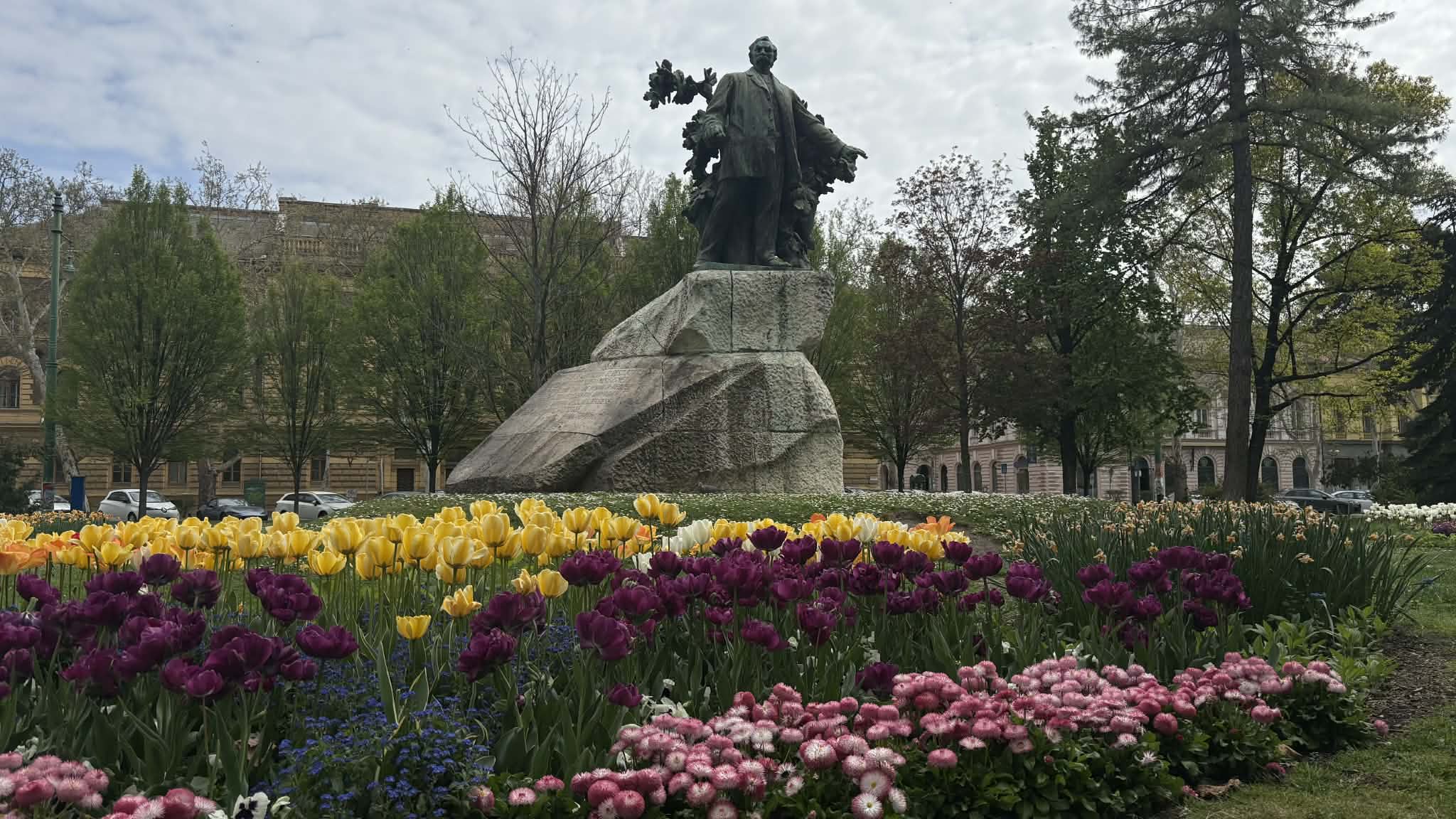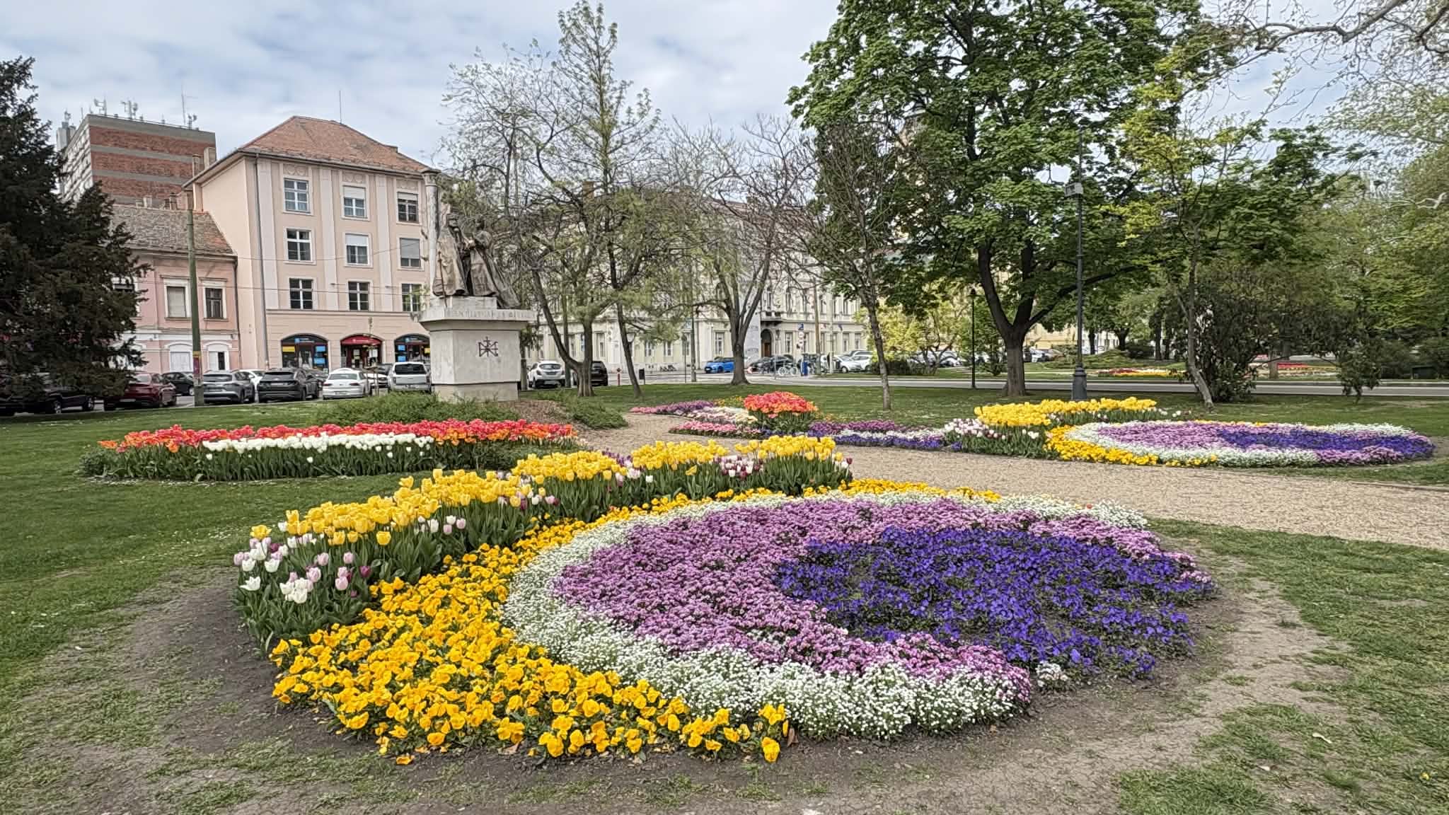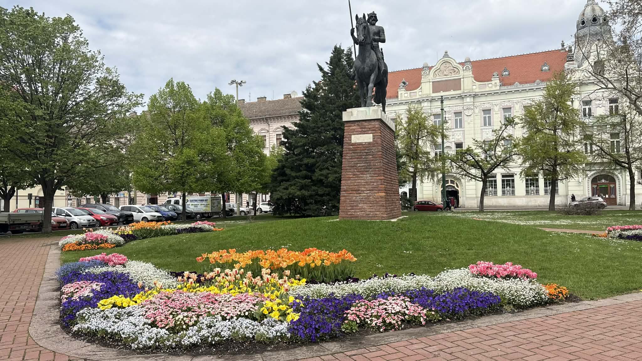 A Széchenyi tér tavasszal mindig különleges: színes tulipánok borítják be az egész teret, mintha a város szíve virágba borult volna. Az arra sétálók megállnak, mosolyognak, fotóznak, vagy csak csendben gyönyörködnek bennük. Olyan ez, mint egy óriási csokor virág, ami nem vázában van, hanem egy egész városnak szól.