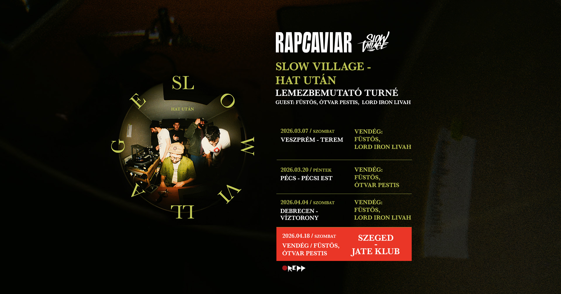 A Rapcaviar Slow Village – Hat után lemezbemutató turnéja április 18-án Szegeden, a JATE Klubban landol, ahol garantált a laza, mégis húzós hangulat. A fellépők között ott lesz Füstös és Ótvar Pestis is, akik tovább tekerik az est vibe-ját.
