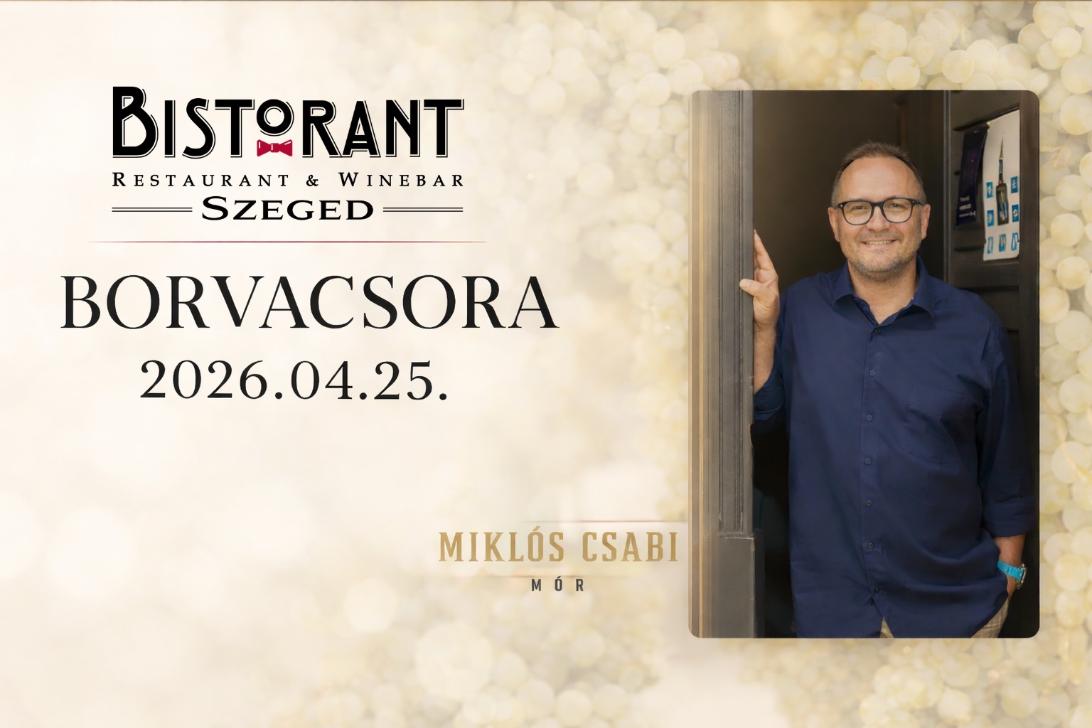 Most pedig ez a két szál nagyon szépen összeér: 2026. április 25-én, szombaton Miklós Csabi érkezik a Bistorantba, vagyis az a móri borász jön Szegedre, akinek a neve a vinoSZFÉRA után is ott maradt a levegőben a borkedvelők között. A Bistorant már április 9-én bejelentette, hogy tavaszra és kora nyárra három különleges borvacsorával készül, ezek közül az első a Miklós Csabi-est lesz. Ez azért erős húzás, mert nem egy egyszerű vacsoráról beszélünk, hanem egy olyan alkalomról, ahol a pohárban és a tányéron ugyanaz a történet fut tovább: karakter, vidék, személyesség és az a fajta hangulat, amitől egy szegedi este tényleg eseménnyé válik.