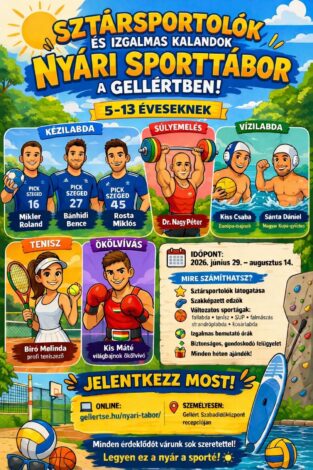 A 2026-os kiadás egyik legnagyobb dobása, hogy a gyerekek ismét ismert sportolókkal találkozhatnak. Érkeznek az OTP Bank-Pick Szeged játékosai, Mikler Roland, Bánhidi Bence és Rosta Miklós, ott lesz Nagy Péter súlyemelő, Kiss Csaba és Sánta Dániel a vízilabda világából, valamint Bíró Melinda teniszező és Kis Máté ökölvívó is. Közben a napi program sem lesz gyenge: fallabda, tenisz, SUP, falmászás, strandröplabda és kosárlabda is szerepel a kínálatban, szakképzett edzőkkel, bemutató órákkal, heti ajándékokkal és folyamatos felügyelettel. Jelentkezni online vagy személyesen, a Gellért Szabadidőközpont recepcióján lehet.