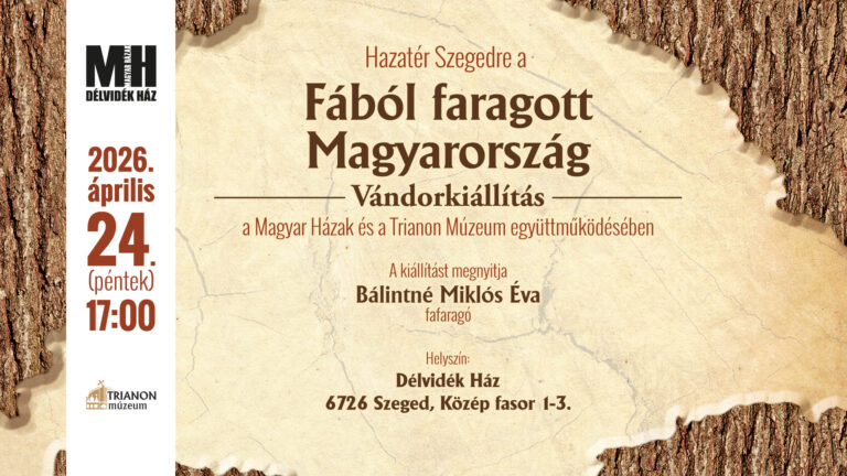 Szegedre nem mindennap tér vissza úgy egy vándorkiállítás, hogy közben végleges otthonra is találjon, a Fából faragott Magyarország viszont most pontosan ezt teszi. A Délvidék Házban április 24-én nyíló tárlat a Trianon Múzeum és a Hagyományok Háza centenáriumi pályázatának legkiemelkedőbb alkotásaiból válogat, és olyan világot mutat meg, ahol a fa nemcsak anyag, hanem emlékezet, identitás … Bővebben: Április 24-én új fejezet nyílik Szegeden: a Fából faragott Magyarország most végleg hazatalál a Délvidék Házba! Ti ott lesztek?