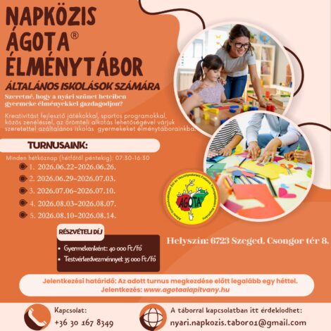 A Napközis ÁGOTA® Élménytábor a nyári szünetben várja az általános iskolásokat Szegeden, a 6723-as irányítószámú Csongor tér 8. szám alatt. A program hétfőtől péntekig, 7:30 és 16:30 között fut, vagyis azoknak a családoknak is komoly segítséget jelenthet, akik a vakáció heteiben szeretnék jó kezekben tudni a gyerekeket. A kínálat pedig messze nem áll meg a felügyeletnél: kreativitást fejlesztő játékok, sportprogramok, közös zenélés és alkotás is szerepel a tábor programjában, vagyis itt tényleg arról szólhat a nyár egy-egy hete, hogy a gyerek feltöltődve érjen haza.