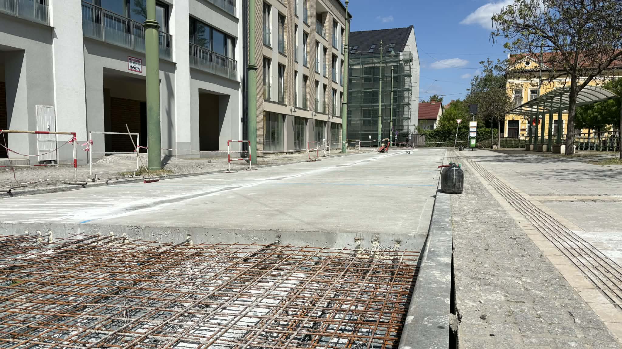 A kivitelezés több ütemben zajlik. A Galamb utcai kanyarban már befejeződött a betonozás, jelenleg a Gőz utcai szakaszon dolgoznak, ahol a vasszerkezeti munkák vannak folyamatban. A következő napokban a középső rész is sorra kerül. A munkák előrehaladásáról így nyilatkozott az alpolgármester: “várhatóan a jövőhét folyamán teljesen kész lesz a bazaltbeton takarás.” Bár a burkolat hamarosan elkészül, a technológia miatt még várni kell a teljes használatbavétellel. A bazaltbeton szilárdulási ideje körülbelül egy hónap, így a projekt várható befejezése – az időjárástól függően – május végére tehető. A városvezetés szerint a mostani felújítás hosszú időre megoldja a problémát. Kovács Tamás úgy fogalmazott: “várhatóan ehhez már soha többet nem kell hozzányúlni.”