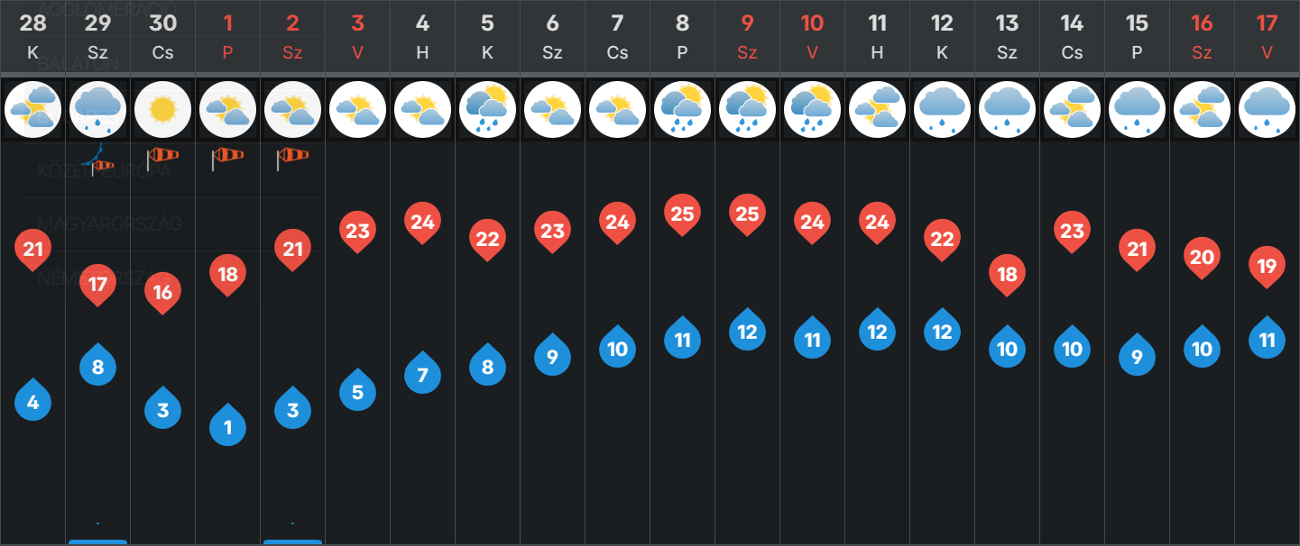 Szerdán, a nap első felében gyakrabban lehet felhős az ég, és elszórtan gyenge eső sem kizárt, de délutánra csökken a csapadék esélye, és szakadozhat a felhőzet. Az északi, északkeleti szél többfelé élénk, időnként erős lehet. A hajnali hőmérséklet -3 és +10, a délutáni csúcsérték 12 és 20 fok között alakul. A felhősebb időben enyhébb lehet a reggel.