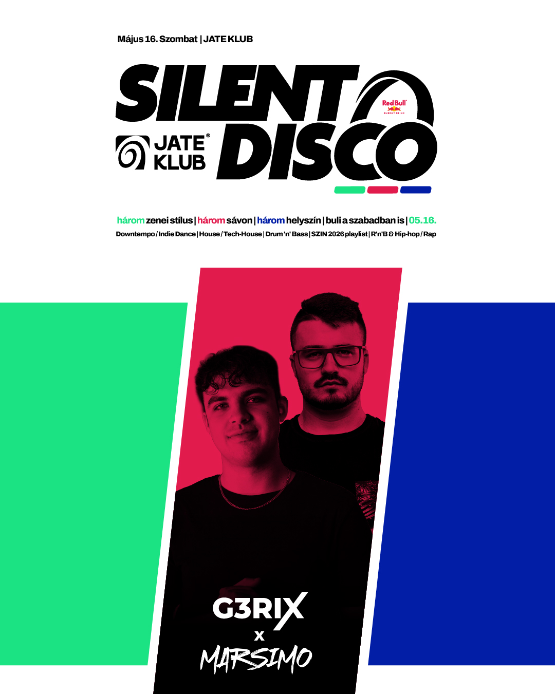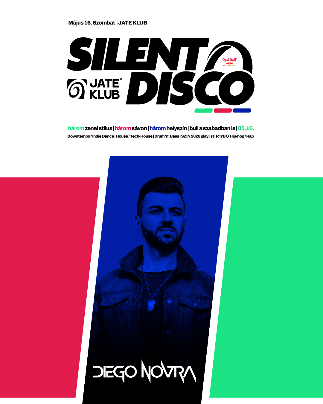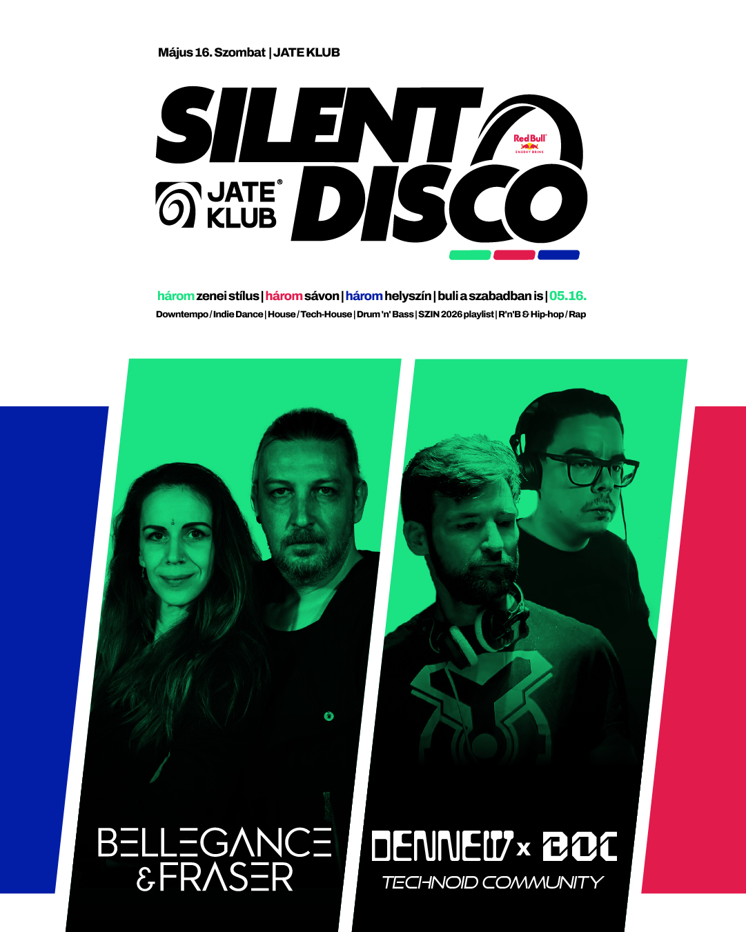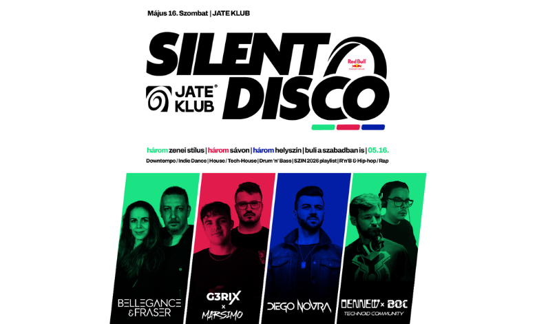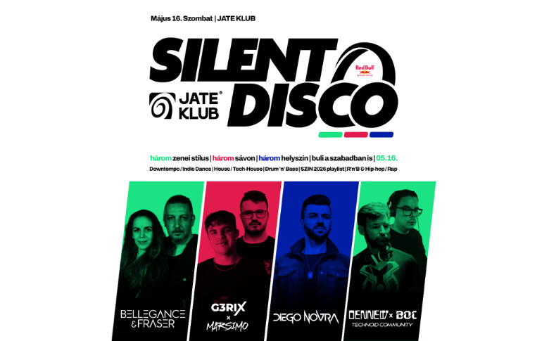 A szervezők ráadásul nem álltak meg annyinál, hogy csinálnak egy szimpla fejhallgatós estét: három helyszínen, három külön világ épül fel a JATE-ban. A nagyterem, a pub és a JATE Terasz is bekapcsolódik, utóbbi pedig különösen ad egy plusz csavart az estének, hiszen a kibővített dohányzó miatt a tavaszi éjszakában, a szabad ég alatt is lehet majd bulizni a fejhallgatókkal. A line up is bőven ad okot a várakozásra: a zöld sávon Bellegance & Fraser, Marsimo, valamint Dennew x Adam Boc érkezik, a piros sávon G3rix hozza a SZIN 2026 playlist hangulatát, a kék sávon pedig Diego Novra építi fel a latin, reggaeton, R&B és hip-hop throwback vonalat. A legfontosabb viszont az, hogy a férőhely limitált, mert ezen az estén a klubban kizárólag fejhallgatóban lehet bent lenni.
