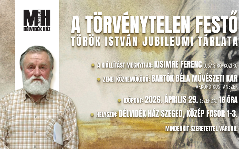 Április 29-én, szerdán 18 órakor Török István jubileumi tárlata nyílik meg a Délvidék Ház Újvidék termében, a 6726 Szeged, Közép fasor 1-3. szám alatt. A 85. születésnapját ünneplő alkotó története már önmagában is filmre kívánkozna: az 1940. június 19-én született művész falusi gyerekként, akadémiai végzettség nélkül indult el a képzőművészet felé, mégis olyan életművet épített fel, amely Stuttgarttól Székelyudvarhelyig, sőt Korčuláig ismertté tette a nevét. Ma is fáradhatatlanul dolgozik palicsi otthona és szabadkai alkotóháza között, miközben pályája során mintegy 180 önálló tárlatig jutott el. A kiállítást Kisimre Ferenc író, újságíró nyitja meg, a tárlat pedig egy hónapon keresztül lesz látogatható Szegeden. A megnyitót zenei közreműködés teszi teljessé, a végén pedig a Délvidék Házban megszokott kötetlen beszélgetés és koccintás is várja az érkezőket.