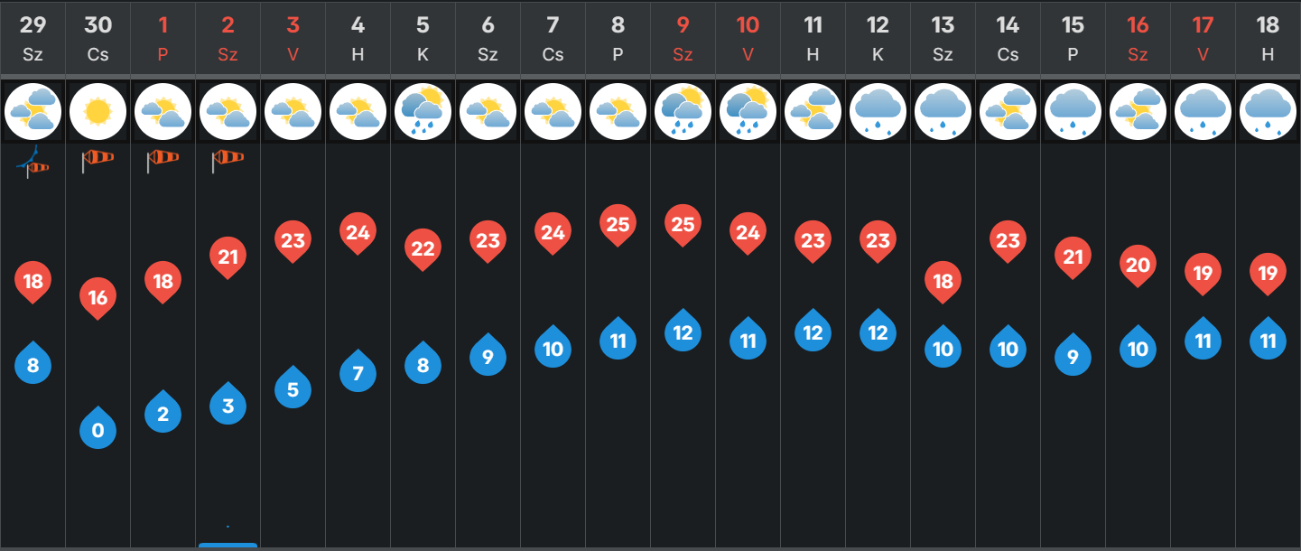 Szerdán változékony időre számíthatunk Szeged térségében. A nap első felében még erősen felhős, időnként borult lesz az égbolt, elszórtan kisebb eső sem kizárt. Délutánra és estére azonban fokozatosan csökken a csapadék esélye, és többfelé felszakadozhat a felhőzet. Az északi, északkeleti szél több alkalommal is megélénkül, helyenként erős lökések kísérhetik. A hőmérséklet hajnalban -2 és +10 fok között alakul, napközben pedig 12 és 19 fok közé melegszik a levegő. A felhősebb időszakokban enyhébb lehet a reggel.