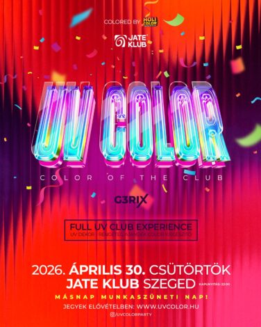 Április 30-án, csütörtökön 22 órától érkezik az UV COLOR 2026 Majális, amelynek már a felütése is elég egyértelmű: másnap munkaszüneti nap, szóval kifogás nincs! A JATE Klub UV-fényben úszó tánctérré alakul, teljes UV klubdekorral, ajándék világító kiegészítőkkel, ingyenes UV arc- és testfestéssel, a pult mögött pedig DJ G3rix pörgeti a zenéket egészen hajnali 4-ig. A szervezők fehér, neon vagy UV-reaktív ruhákat ajánlanak, a belépés 16 éves kortól lehetséges, az elővételes jegyeket pedig az uvcolor.hu oldalon találod. Ez az a csütörtök, amikor az április nem csendben ér véget, hanem színekben, fényekben és egy nagy közös szegedi hajnalban.