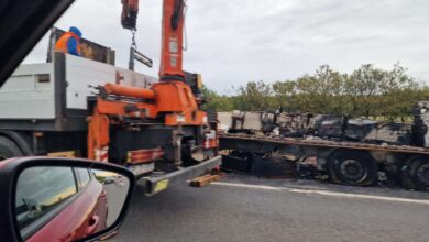 Masszív torlódás van az M5-ösön, oda-vissza: az egyik oldalon terelést bontanak, a másikon a kiégett kamion mentése zajlik (videóval)