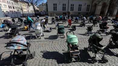 Babakocsikkal emlékeztek a háború gyermekáldozataira Lviv főterén
