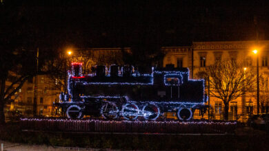 A hatalmas, kivilágított karácsonyi ajándékok mellett ünnepi köntösbe öltözött Szeged jellegzetes, technikatörténeti értékű 375-ös gőzmozdonya is a MÁV igazgatóság kertjében,…
