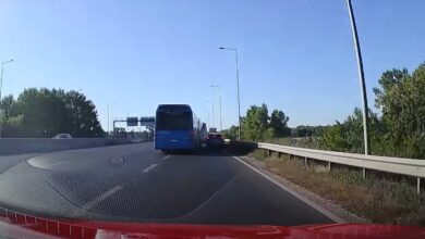 Csuklós busz kent fel majdnem a szalagkorlátra egy Ford Fiestát az M5-ös kivezető szakaszán (videóval)